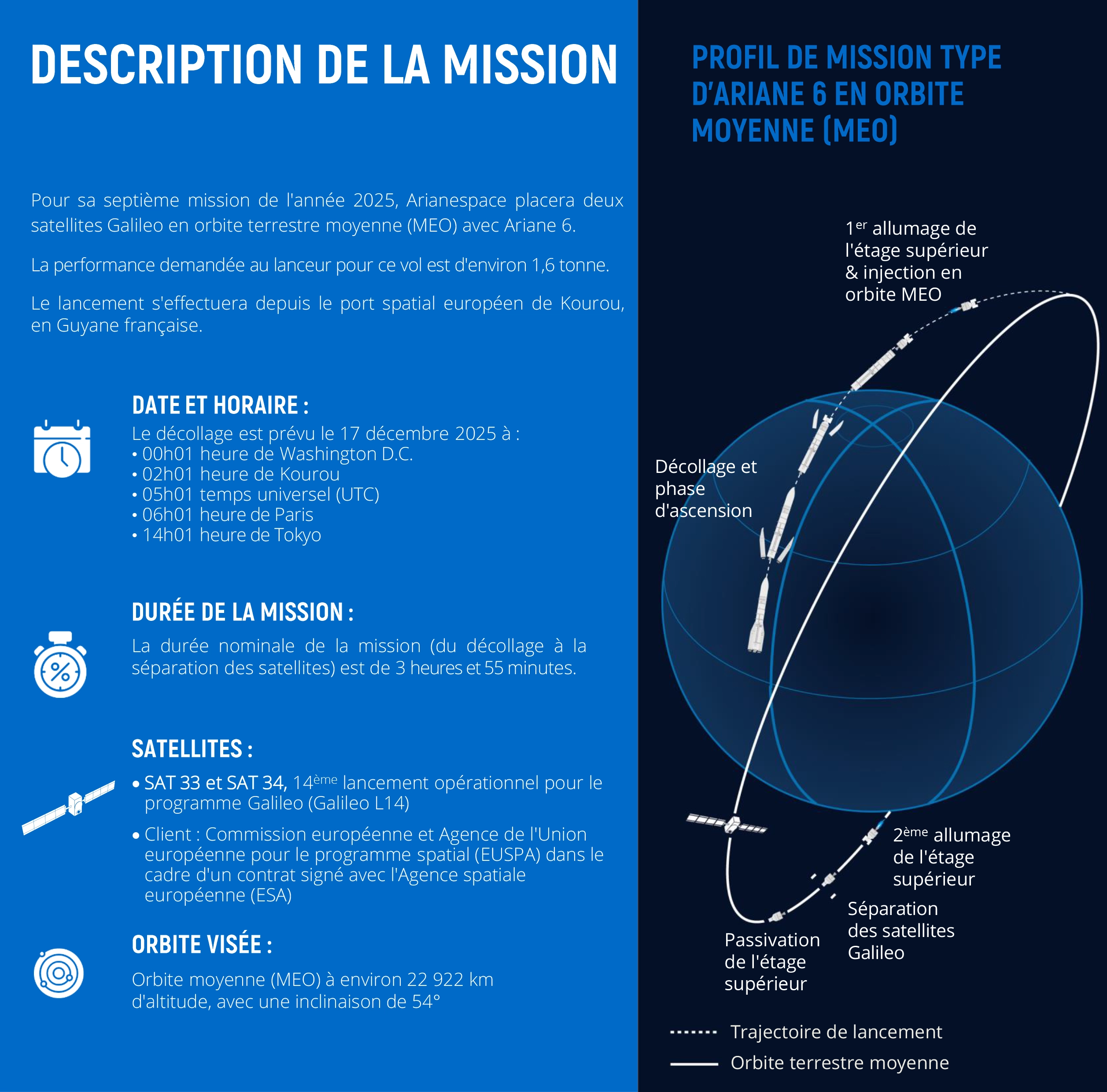 Le 17 décembre 2025 à 05h01 UTC (02h01 heure locale), la fusée européenne Ariane 6 s’élancera depuis le Centre spatial guyanais pour sa mission VA266, un vol à double enjeu : consolider la constellation Galileo, le système de navigation par satellite de l’Union européenne, et affirmer la souveraineté spatiale de l’Europe. Ce cinquième vol d’Ariane 6, dans sa configuration à deux boosters (Ariane 62), placera en orbite deux nouveaux satellites Galileo (SAT 33 et SAT 34), renforçant ainsi une constellation déjà essentielle pour des milliards d’utilisateurs à travers le monde. Après le succès de la mission VA265 en novembre, ce lancement clôturera l’année 2025 en symbolisant l’autonomie européenne en matière d’accès à l’espace et de technologies de navigation, face à la concurrence des GPS américain, Glonass russe ou Beidou chinois.